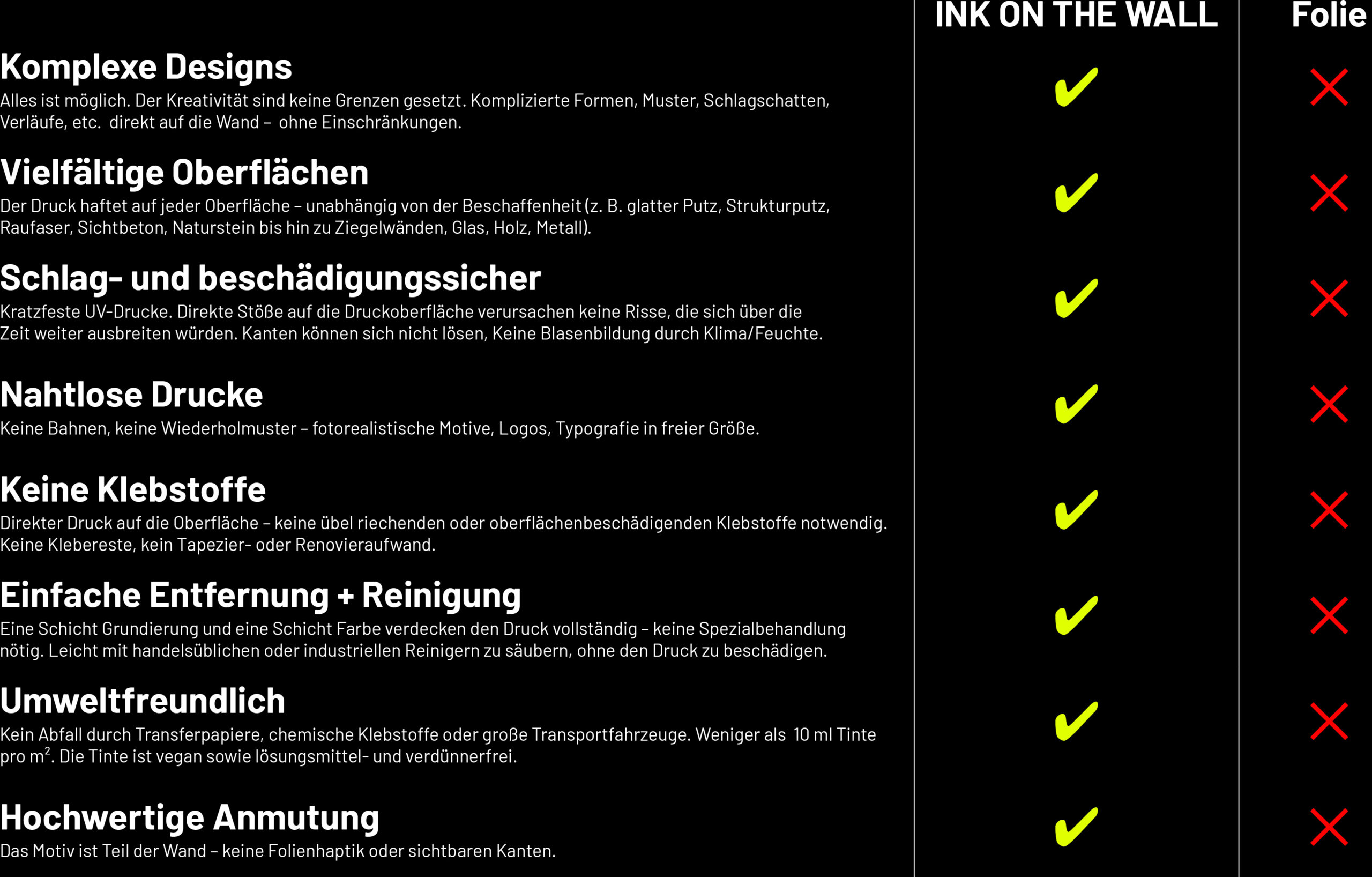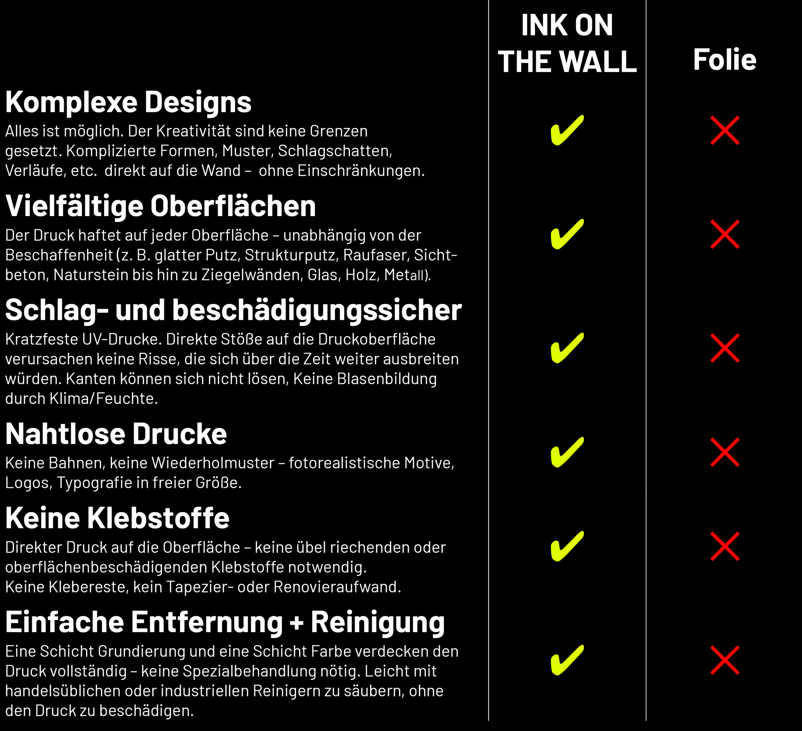 Wir machen Wandgestaltungen möglich, die mit herkömmlichen Methoden (Folie, Fototapete) nicht oder nur eingeschränkt realisierbar sind.